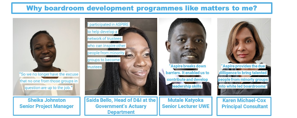In support of the National Lottery’s ambition to reduce inequality by helping communities thrive, in 2021 BeOnBoard was funded by NTL to deliver Aspire. This was a pioneering pilot Boardroom development programme designed to break down barriers to diversifying trusteeship whilst nurturing inclusive governance. A key Aspire ambition was to co-create, test, learn, prove, share, and scale a new model for moving the dial on racial diversity amongst VCSE boards.